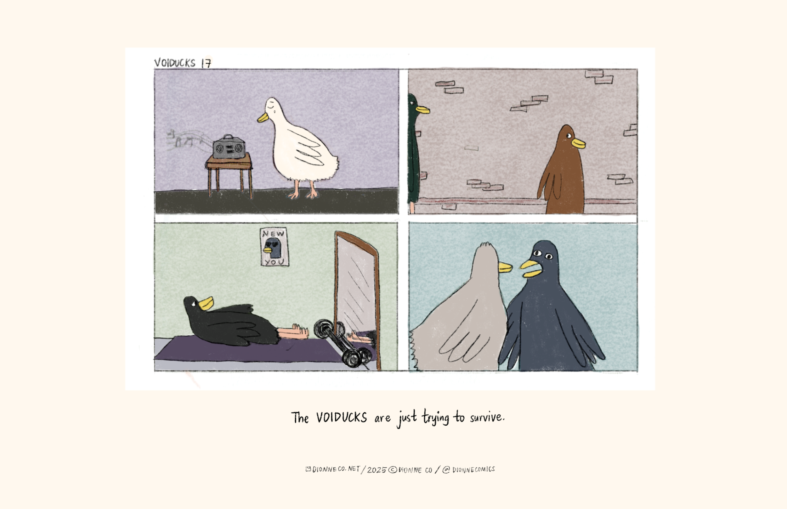 A self-published book of 20 comic strips depicting the Voiducks in various uncomfortable situations in everyday life. Voiducks is a project of Dialectical Comics, my small press that prints funny and serious comics.